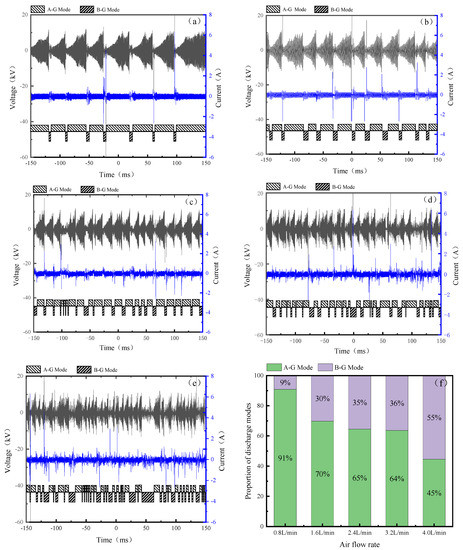 Waveform and discharge mode ratio under different air flow rates. (a) 0.8 L/min; (b) 1.6 L/min; (c) 2.4 L/min; (d) 3.2 L/min; (e) 4.0 L/min; (f) proportion of discharge modes.