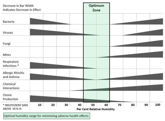 Some studies indicated a relation between humidity, indoor-measured visible biological contaminant growth, and its effects on human health. Sterling et al. [13] analyzed the humidity impact on contaminants (such as viruses, bacteria, and fungi) and the possible impacts on human health. At room temperature, the authors observed that the required humidity range for minimizing risks to human health by biological contaminants was between 40 and 60%, as shown in Figure 1.