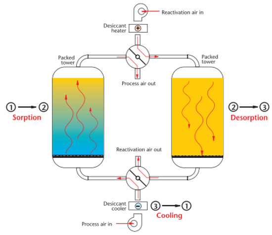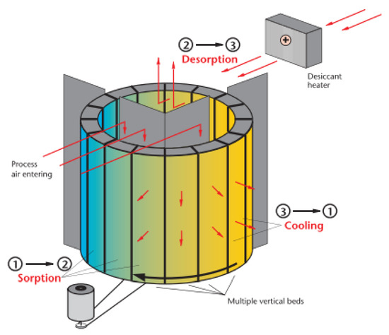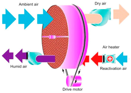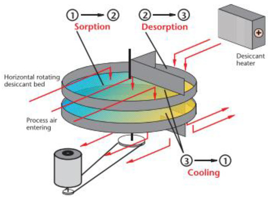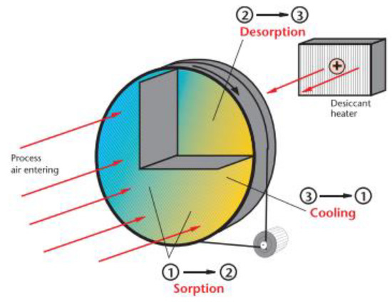 During operation, the wheel rotates continuously and the desiccant cycles through adsorption, regeneration, and cooling every 4–5 min. Drying air is constantly regenerated in a closed circuit. The hot regeneration air passes through the desiccant medium, releasing the released moisture into the atmosphere [60]. No ambient air is introduced into the process because desiccant cooling is conducted using dry air. The desired dew point is achieved by changing the spin speed and other dryer variables without excessively drying the thermally sensitive materials [61]. Desiccant wheels are used in various heating and residential environments to prevent the growth of mold and mildew. As conventional air conditioning systems are limited, desiccants remove moisture (latent energy) in hot and humid climates [62].