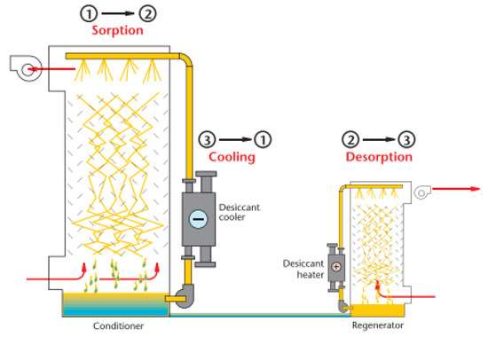 The spray drying tower (Figure 5) has two tanks corresponding to the condenser and the regenerator. In this system, the humid air enters the segment of the condenser and passes through a saline fog that will capture the humidity of the air, while the dry air is inflated for the process. At the bottom of the condenser tank, the saline solution is pumped to the second tank (regenerator), through which the second flow of high-temperature external air passes, causing the saline solution to lose moisture to the regeneration air. Thus, the hygroscopic material returns to the condenser tank [63].