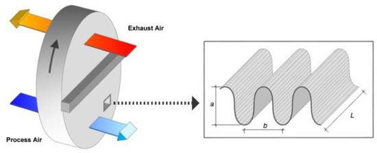 The rotary heat exchanger (Figure 10), commonly known as an enthalpy wheel, is an “air-air”-type heat exchanger that works on the principle of sensible heat (temperature) and latent heat (humidity) exchange between the flow of renewal air and the flow of exhaust air [74]. Enthalpy wheels can be classified as sensible heat wheels and enthalpy wheels. The denomination for these two types is due to their application, where the sensible heat wheels act with the function of only exchanging the sensible heat, while the enthalpy wheel works completely between the energies of the air (the sensible heat and the latent heat). These two processes occur between the two air masses that travel through the equipment [75].