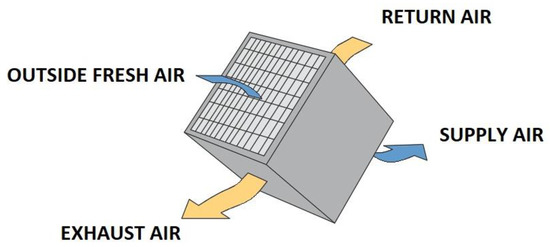 The cross-flow heat exchanger is an “air-to-air” static heat exchanger. Like the enthalpy wheel, the cross-flow heat exchanger can be classified into two types [80]. The sensible cross-flow heat exchanger performs the function of only sensible heat exchange between the two air masses, and the conventional cross-flow heat exchanger (Figure 11) exchanges sensible heat and latent heat during the thermal exchange process of the equipment [81].