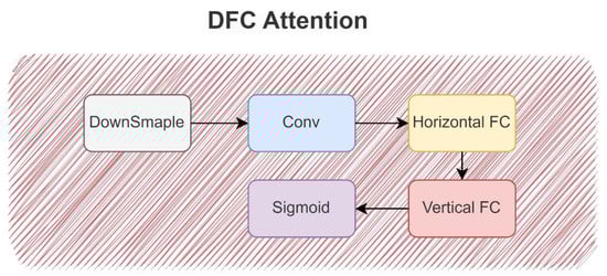 Compared with the efficient Ghost module, DFC Attention is not so concise. Directly processing this attention mechanism in parallel with the Ghost module will introduce high computational costs. In general, reducing the height and width of the features to half of their original length will reduce 75% of the FLOPs of DFC Attention. Therefore, downsampling the feature size in the horizontal and vertical directions can improve the speed of DFC Attention execution.