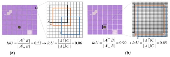 The sensitivity analysis of IoU on tiny and normal scale objects. Note that each grid denotes a pixel; box A denotes the ground truth bounding box; boxes B and C denote the predicted bounding boxes with 1 pixel and 4 pixels diagonal deviation, respectively. (a) Tiny scale object; (b) Normal scale object.