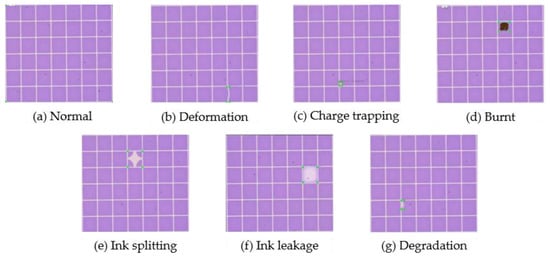 Electrowetting (EW) is a phenomenon in which an electric field is used to alter the contact angle of a droplet on a solid surface, enabling precise manipulation and regulation of the droplet. In the 1980s, Beni et al. [] demonstrated the electrowetting effect using mercury droplets and coined the term “electrowetting,” initiating research in this field. In the 1990s, Sondag-Huethorst and Fokkink et al. [,] observed the electrowetting effect on sulfide-modified metal electrodes but were still limited by electrolysis. Berge et al. [] proposed covering the metal electrode with an insulating layer to solve the electrolysis problem, leading to rapid development of electrowetting technology. Electrowetting technology offers several advantages, including fast response time, low power consumption, simple structure, and high integration [,,], making it one of the future directions for display technology. In recent years, significant breakthroughs have been made in electrowetting display technology, achieving long-term stable video display and laying the foundation for industrial production. However, the production process is prone to various imperfections, and defects, such as burn-in, charge trapping, and pixel wall distortion, are frequently observed and documented in numerous experiments, compromising the display quality and economic value []. To improve the commercialization of electrowetting display technology, non-destructive testing methods, such as deep learning, must be used to accurately identify and classify defects in electrowetting devices. Statistical analysis should also be conducted to determine the causes and locations of defects and improve and repair device structure and production processes.