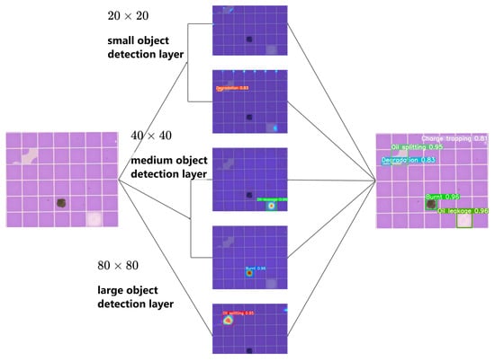 The three modules exhibit excellent performance in terms of detection accuracy and network lightweighting. By integrating them simultaneously into the network, we obtained the proposed EW-YOLOv7 model, whose detection process is illustrated in Figure 8. The integration of the lightweight GhostNetV2 module reduced the number of network parameters and GFLOPS by 19.2% and 64.3%, respectively, compared to the original YOLOv7 model, significantly decreasing the amount of network computation. The inference time and weight size of EW-YOLOv7 were reduced by 28.9% and 28.4%, respectively, greatly enhancing its deployment capability. In terms of detection accuracy, the optimization of the Acmix attention mechanism and NGWD loss function for detecting defects, particularly small target defects, improved the network’s ability to identify such defects and increased its average detection accuracy by 8.7% compared to the original network. The experimental results demonstrate that EW-YOLOv7 outperforms the original YOLOv7 network in terms of detection accuracy, speed, and lightweight deployment and is well-suited for defect detection in the industrial production process of electrophoretic display devices.