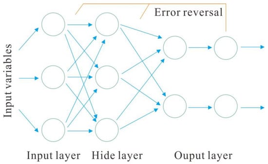 BPANN is a multilayer feedforward network that propagates according to reverse errors using a dual mechanism of learning signal forward propagation and error backpropagation to train data. The BP algorithm takes the square of network error as the objective function and uses the gradient descent method to calculate the minimum value of the objective function [,]. Figure 1 shows a typical basic neural network structure. Each part of the structure plays its role; the input layer is mainly responsible for receiving information transmitted from the outside world, and the output layer serves as the output part of the processed structure of the output system. The hidden layer with the most important role is located between the input and output layers and is mainly responsible for processing the external information transmitted by the input layer. We plan to establish a production capacity prediction model using the BP neural network model, a classic and important forward network model. The two important principles of the BP neural network model are forward data transmission and error feedback correction, as shown in Figure 1.