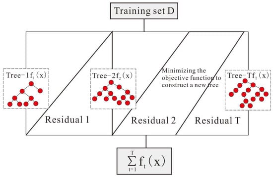 GBDT is a machine learning model with excellent predictive power. The residuals between the calculated and target values are quickly categorized and analyzed by regression trees and then continuously reduced using a step-up algorithm so that the calculated value gradually approaches the target value. This method is flexible in handling various data types and achieves high prediction accuracy with a short tuning time. Given that the regression tree handles various residual values differently, the training results will not be affected even when the sample has incorrect sample points. The core idea of the GBDT algorithm uses the negative gradient value of the loss function as an approximation of the loss value of the base model in multiple base models. This approximation is then applied to construct the base model in the next round, simplifying the solution of the objective function. The steps of GBDT implementation are shown in Figure 3.