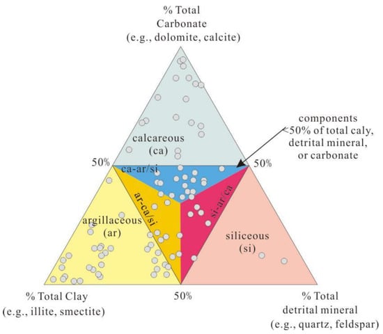 The mud shale strata in the Liaohe Depression, located in the northeast Bohai Bay basin, represent a typical mixed sedimentary sequence that has formed due to the combined effects of mechanical and chemical sedimentation of land-derived debris. The coexistence of various types of rocks, such as shale, mudstone, dolomitic mudstone, and dolomite, results in considerable variations in composition, structural features, and organic matter abundance. Different types of mud shale rocks can be effectively distinguished through classification based on the lithofacies of fine-grained sedimentary rocks. Mineral composition, sedimentary structure, and organic matter abundance are the frequently employed classification indicators for the lithofacies of fine-grained sedimentary rocks [,,,,]. For the crucial step of rock naming, this paper adheres to existing research findings and adopts a three-end-member petrological classification [,,,]; clay minerals, felsic minerals (land-derived debris), and carbonate minerals (primarily dolomite) are considered as the three end members. Based on a 50% threshold, these rocks are categorized into four main types, as shown in Figure 1: clayey, felsic, dolomitic, and mixed. Considering the variations in organic matter content and occurrence state among different lithofacies of mudstone in the study area, those exhibiting total organic carbon (TOC) contents > 2% are classified as organic-rich mud shale, whereas those with TOC contents < 2% are referred to as organic-poor mud shale [,]. In terms of sedimentary structure parameters, stratification serves as one of the most important features of fine-grained sedimentary rocks []. This paper integrates the stratification scale parameters employed by various researchers for lithofacies classification to summarize stratification scales and names. They are distinguished from conventional rocks in terms of macroscopic massive (>1 m) and layered structures (subdivided based on the scale: 0.5–1 m thick layers, 0.1–0.5 m medium layers, 0.01–0.1 m thin layers, and <0.01 m shaly layers). The term ‘laminae’ (<1 mm, primarily concentrated within the 0.01–0.5 mm range) is introduced to describe the stratification of the meso-microstructure of fine-grained sedimentary rocks, and laminae may also be present in rocks with massive structures.