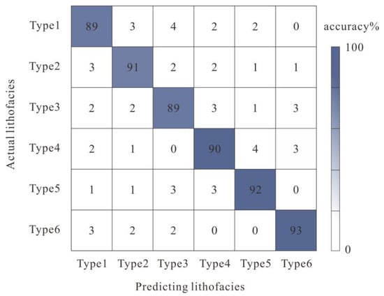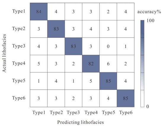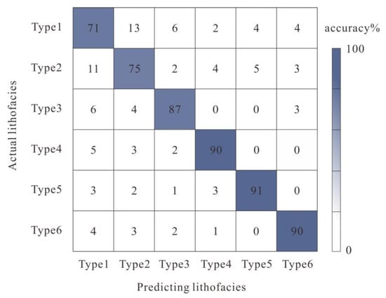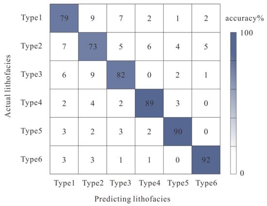 During the process of optimizing the support vector machine model, two hyperparameters need to be adjusted: the kernel function and another parameter that varies depending on the chosen kernel function. These two parts are not parallel. To optimize these hyperparameters, the grid search algorithm is utilized. The SVM model with the best performance in this learning process is the SVM-polynomial kernel with the following hyperparameters: c = 1.1, Gamma = 0.7, and d is left unspecified. The confusion matrix diagram (Figure 11) for discriminant analysis of lithofacies by the SVM algorithm shows that the accuracy of identifying shale lithofacies is 87.3%. The accuracy of identifying various lithofacies types is 86%, 87%, 89%, 86%, 89%, and 85%, respectively. Overall, the recognition effect is relatively good.