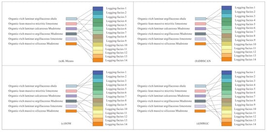 This paper comprehensively develops four unsupervised learning algorithms for shale lithofacies identification using the concept of logging facies. The identification process involves a complicated correspondence due to the different types of logging facies corresponding to different types of shale lithofacies. Organic-rich laminar argillaceous shale and organic-rich massive argillaceous mudstone correspond to multiple logging facies types due to their relatively complex types (Figure 12).