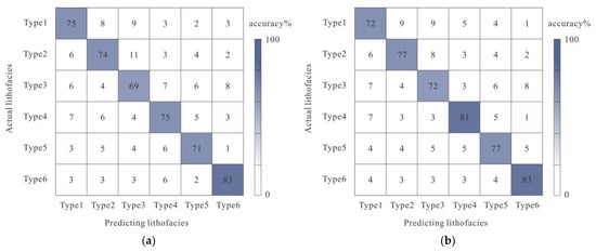 In academic research, the accuracy of an algorithm can be evaluated by using a confusion matrix diagram. This tool helps to visually measure and predict how well the algorithm matches discrete lithofacies intervals. The correct classification rate index is used to indicate the percentage of correctly estimated data points from the total number of evaluated data points. This index is useful for assessing the accuracy of distinguishing each lithofacies by each model.
