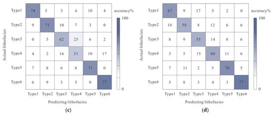 Confusion matrix of unsupervised learning algorithm. (a) Confusion matrix diagram of K-means algorithm for the discrimination and analysis of shale facies. (b) Confusion matrix diagram of DBSCAN algorithm for the discrimination and analysis of shale facies. (c) Confusion matrix diagram of SOM algorithm for the discrimination and analysis of shale facies. (d) Confusion matrix diagram of MRGC algorithm for the discrimination and analysis of shale facies.