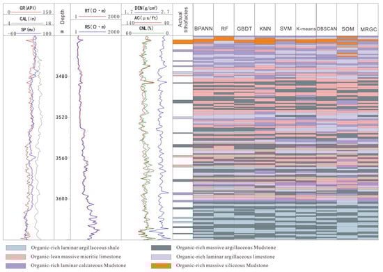 The lithofacies and logging facies of four supervised learning algorithms were compared to identify lithofacies of verification wells. The results are shown in Figure 13. The K-MEANS algorithm had an identification accuracy of about 76.1%, the DBSCAN algorithm had an accuracy of about 77%, the SOM algorithm had an accuracy of about 67%, and the MRGC algorithm had an accuracy of about 64.5%. Overall, the accuracy of shale identification results using unsupervised learning algorithms is relatively low, with the DBSCAN and K-MEANS algorithms having higher accuracy.
