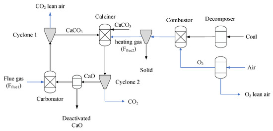In the carbonator, the solid product of CaCO3 is delivered to the calciner by conveyor, and the CO2-lean gas (tail gas) is emitted into the air after cyclone 1. In the calciner, the calcium carbonate decomposition reaction described in Equation (1) is carried out at a temperature of around 940 °C; notably, the solid product of CaO flows back to the carbonator by conveyor, and the high-purity CO2 gas is easily produced after cyclone 2. The oxyfuel coal combustion is used to provide the heating source for the high-temperature heating gas (Fflue2). The deactivated CaO is removed and the fresh CaCO3 is added to maintain the stable operation of the calciner.