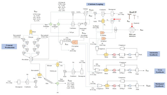 Scenario 1: A DCPP-based polygeneration system for producing clinker, urea, and methanol simultaneously, shown in Figure 4, is named Scenario 1. Notably, the hydrogen production unit is the PEM water electrolysis, heat exchangers 1 and 2 are added to recover the waste heat of the outlet gas streams from the CaL process, and the deactivated CaO is added to the pre-calciner. The CO2 gas with a concentration of 99.96% from the calciner is split into three streams. The first stream is the CO2 product due to its concentration of over 99.9%; the second stream is fed into the urea synthesis process for producing urea; and the third stream is fed into the methanol synthesis process for producing methanol. Hydrogen from the PEM water electrolysis is split for the processes of ammonia synthesis and methanol synthesis; oxygen from the ASU and the PEM water electrolysis is fed into the combustor; and nitrogen from the ASU is fed into the ammonia synthesis process. It is noted that the flue gas from the CPP is fully captured by the CaL process; 100% of H2 is consumed, 94% of N2 is not consumed, and 100% of CO2-lean gas (tail gas) from the carbonator is emitted into the air.