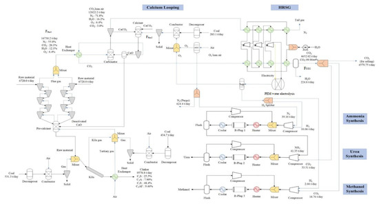 Scenario 3: A DCPP-based polygeneration system for producing clinker, urea, and methanol simultaneously, shown in Figure 6, is named Scenario 3. As compared to Scenarios 1 and 2, the heat recovery steam generators (HRSG) in Scenario 3 provide continuous power supply by recovering the waste heat of tail gas from the CaL process. The HRSG is designed to cover the demand of the PEM water electrolysis such that the duty of the RenE2P is effectively reduced. After the HRSG, the CO2 gas with a concentration of 99.96% from the calciner in the CaL process is split into three streams: 100% of H2 is consumed, 94% of N2 is not consumed, and 100% of CO2-lean gas (tail gas) from the carbonator is emitted into the air.