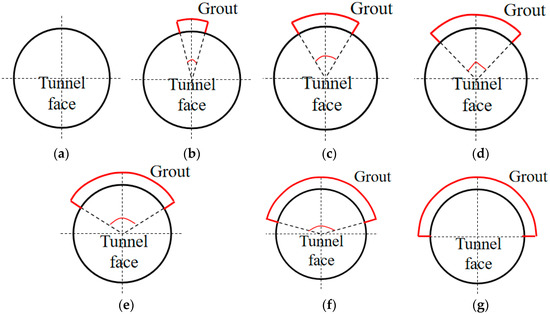 Shield tunneling is associated with significant risk in the case of poor geological conditions and complex surroundings. Generally, horizontal pre-grouting is adopted to reinforce the soil layer to decrease the risks associated with excavation. The efficiency of excavation is affected by the range of reinforcement of this horizontal grouting. Seven kinds of grouting reinforcement ranges are listed in Figure 1, as described in field grouting experiments. In Figure 1, the red line indicates the grouting zone and the symbol A represents the center angle of a circular tunnel. Figure 1a shows non-grouting reinforcement, and Figure 1g shows upper semicircular grouting reinforcement.