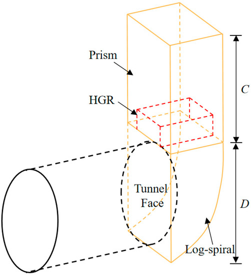 Previous research [30,31] has shown that the failure zone of a shallowly buried tunnel can extend to the ground surface if the tunnel face is unstable. The slip surface in front of the tunnel face can be more accurately described by a logarithmic spiral rather than a straight line in the longitudinal section [32]. To predict the limit support pressure of the tunnel face after horizontal pre-grouting reinforcement, a theoretical model based on the limit equilibrium method was established, as depicted in Figure 2. The model consists of a log-spiral slip surface in front of the tunnel face and an overlying prism vertically downward with horizontal grouting reinforcement (HGR), similar to classical wedge models. The variable D represents the tunnel diameter, and C denotes the thickness of the cover layer above the tunnel crown. To simplify the construction of the model mechanism, the circular cross-section of the shield face is approximated by a square with the same area [27,32]. Research has indicated that this simplification is acceptable, as the predicted limit support pressure obtained from this model can reasonably match the pressure obtained from existing studies [3,17,33]. The arc grouting zone is also simplified accordingly.