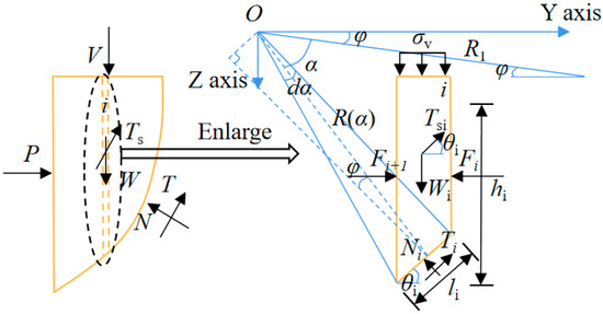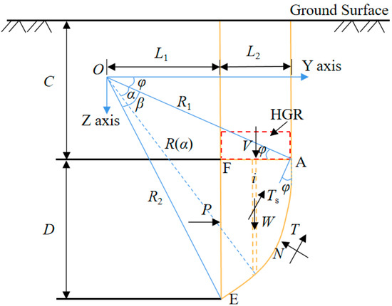 Figure 3 depicts a coordinate system established with point O as the origin, and the Y-axis and Z-axis parallel to the horizontal and vertical directions, respectively. The longitudinal section of the slip surface is bounded by a logarithmic spiral that emerges from point A and ends at point E.