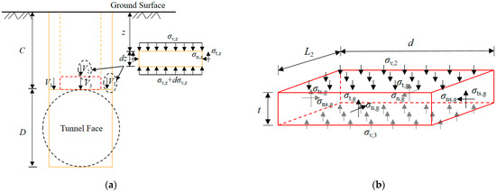To consider the soil arching effect above the tunnel, a soil unit is incorporated for moment analysis (as shown in Figure 4a). The equation of vertical stress equilibrium can be expressed as follows, in accordance with Terzaghi’s earth pressure theory: