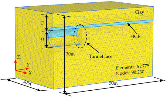 To investigate the stability of the tunnel face, half of the model was created based on the symmetry between structure and load, as depicted in Figure 6. The shield tunneling was simulated in the Y-axis with a diameter of 6.6 m (D) and a depth of 6.6 m (C). The model was designed to be sufficiently large to eliminate any boundary effects, with dimensions of 30 m in the X-direction and Z-direction and 50 m in the Y-direction. The boundary conditions were specified as follows: the ground surface was free, the four vertical surfaces in the normal directions were fixed, and the base was fixed as well. Since the groundwater table was assumed to be located well below the tunnel invert, it was not taken into account in the analyses. Once the model was meshed, it consisted of 22,758 nonuniform elements and 34,654 nodes.