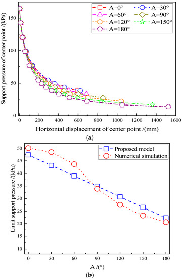 Determination of the limit support pressure (a) Relationship between the support pressure and the horizontal displacement (b) Relationship between the limit support pressure and A (°).