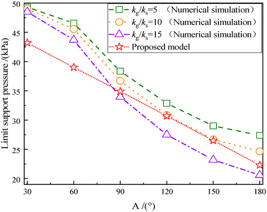 The effect of changes in HGR stiffness on the limit support pressure with A (°) values ranging between 30° and 180° is shown in Figure 8; the effective cohesion and effective friction angle of clay and the HGR, as well as the burial depth of the tunnel, were kept constant. In addition, for the limit equilibrium model, the wedge was assumed to be a rigid body and the stiffness parameter was not included in the theoretical formula, which was found to be acceptable simplifications by many studies [26,27,32]. In Figure 8, kg is the stiffness of the HGR, and ks is the stiffness of clay. The three stiffness ratios predicted using a numerical simulation show similar trends in limit support pressure with increasing A. It was found that when A is small, the stiffness ratios have little influence on the limit support pressure of the tunnel face. The predicted results of the three stiffness ratios are 49.3 kPa, 49.0 kPa, and 48.5 kPa when A = 30°; with increasing A, the gap between the three stiffness ratios increases. When A = 180°, the limit support pressures predicted using the three stiffness ratios are 27.4 kPa, 24.7 kPa, and 20.6 kPa, respectively. Furthermore, as the HRG in the proposed model is rigid, increasing the stiffness ratio makes the predicted results of the numerical simulation more relevant to the proposed model.