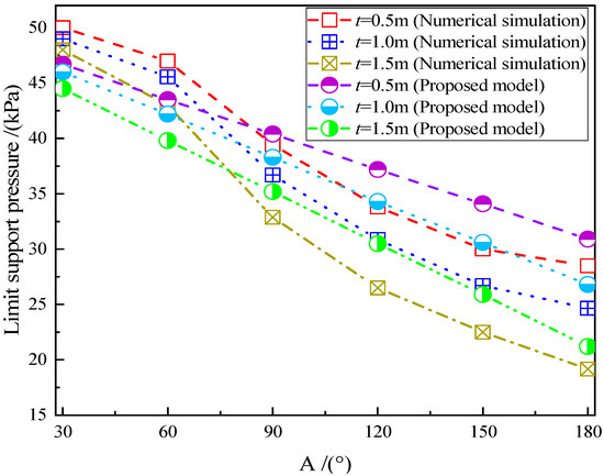 The effect of changes in HGR thickness on the limit support pressure with A (°) values ranging between 30° and 180° is shown in Figure 9; the effective cohesion and effective friction angle of clay and the HGR, as well as the burial depth of the tunnel, were kept constant. The three thicknesses predicted using the numerical simulation show that with increasing A, the variation in the limit support pressure first decreases slowly, then decreases rapidly, and finally decreases moderately. Additionally, the limit support pressure predicted by the proposed model under the three thicknesses decreases linearly with A. Furthermore, it is obvious that when A is small, the thickness of the HGR has little influence on the limit support pressure of the tunnel face, and this degree of influence increases with A, which is consistent with the observation in Figure 8. This is mainly because when A is small, the gaps in reinforcement volume of the HGR across different thicknesses are small, and the ability to maintain the stability of the tunnel face is weak, so the limit support pressure changes little.