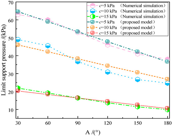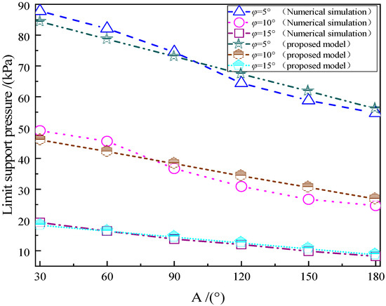 The effect of the effective friction angle of clay on the limit support pressure with A (°) values ranging between 30° and 180° is shown in Figure 11. Essentially, the limit support pressure of the tunnel face predicted using a numerical simulation (or the proposed model) decreases linearly with increasing A. Meanwhile, the absolute values of the line slopes decrease as the effective friction angle increases. When the friction angle increases from 5° to 15°, the predicted results of the proposed models are 84.4 kPa, 46 kPa, and 18.3 kPa at A = 30°, and 56.1 kPa, 26.8 kPa, and 8.7 kPa at A = 180°, indicating that the limit support pressure is more sensitive to variations in A with low effective friction angle compared to conditions of high effective friction angle.