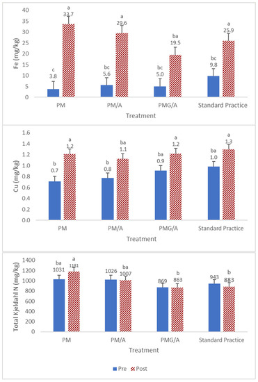 Soil nutrient content: iron (top), copper (middle), and total Kjeldahl nitrogen (bottom) at 0–15 cm depth of experimental site soils before (Pre) and after two years (Post) of soil treatment applications. P is pecan tree biomass; M is manure; G is “green-chop” (legumes); A represents additions prescribed by the compost consulting company (see Table 1). Standard practice is the application of shredded pecan pruning biomass and manure without composting. Different letters indicate statistical significance between all treatments and times.
