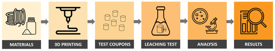 Each of the 3D-printed samples were immersed in both artificial sweat and water media, allowing the potential leaching from each composite during use and washing phase, respectively. In detail, the experimental setup of the leaching test comprised 8 samples: