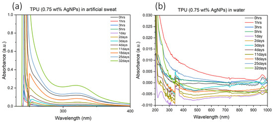 UVVIS spectrum for TPU with 0.75 wt% AgNPs 3D-printed test coupon immersed in artificial sweat (a) and/or water (b) from 0 h to 32 days.