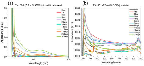 UV-VIS spectrum for TX1501 with 7.3 wt% CCFs 3D-printed test coupon immersed in artificial sweat (a) and/or water (b) from 0 h to 32 days.