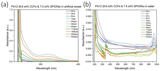 UV-VIS spectrum for PA12 with 8.6 wt% CCFs and 7.5 wt% SPIONs 3D-printed test coupon immersed in artificial sweat (a) and/or water (b) from 0 h to 32 days.