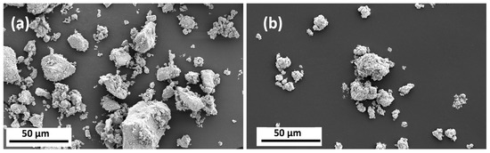 SEM images of raw nanoparticles used as additives for the thermoplastic nanocomposite filaments (a) SPIONs and (b) AgNPs. Both materials form aggregates with abstract shape. Imaging utilizing secondary electron detector, magnification 2550× and 5 KV.