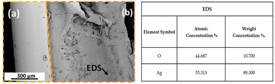 SEM image of a TPU nanocomposite filament with 0.75 wt% AgNPs. Area (a) inside the yellow dotted box denotes the surface of the filament, while the area (b) within the orange dotted box, represents the surface of a longitudinal section. EDS analysis performed on the white spot (indicated by the black arrow) shows the presence of oxygen and silver within the polymeric matrix. Imaging utilizes backscattered electron detector: magnification 350× and 5 KV.