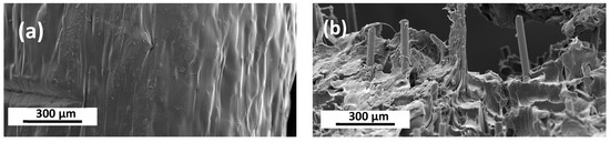 SEM image of a TX1501 with 7.3 wt% CCFs. (a) Surface morphology of the nanocomposite filament. White arrows denote the evidence of the CCFs near the surface of the filament. Magnification 350×. (b) Protruding CCFs from TX1501 polymer matrix at 2550× magnification. Imaging utilizing secondary electron detector and 5 KV.