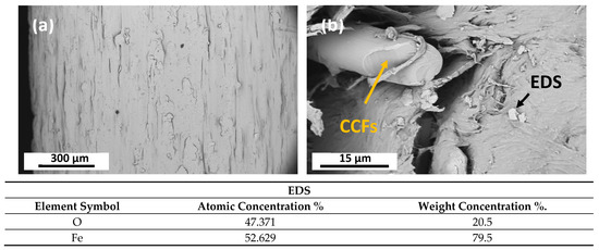 SEM image of a PA12 filament with 8.6 wt% CCFs and 7.5 wt% SPIONs. (a) Filament’s surface morphology at 350× magnification. (b) Detailed image showing protruding CCFS and SPIONs at 8600× magnification. Orange arrow shows the presence of the CCFs, while the black arrow represents the evidence of SPIONs after EDS analysis. Imaging utilizes backscattered electron detector and 5 KV.