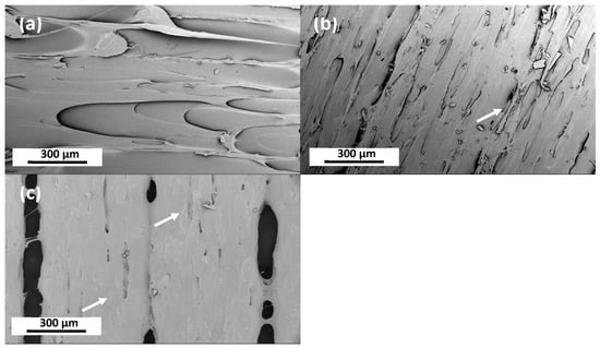 Surface SEM images right after the 3D printing process (a) TPU with 0.75 wt% PVP-coated AgNPs (18 nm average size), (b) TX1501 (Tritan Copolyester TX1501HF—Eastman) with 7.3 wt% CCFs, and (c) PA12 with 8.6 wt% CCFs and 7.5 wt% SPIONs. Entrapped CCFs in both (b,c) images, within the polymeric matrices, are indicated with white arrows. Imaging utilizes backscattered electron detector: 350× magnification and 5 KV.