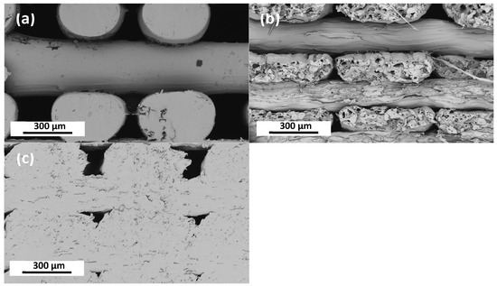 Cross-section images of 3D-printed test coupons (a) TPU with 0.75 wt% PVP-coated AgNPs (18 nm average size), (b) TX1501 (Tritan Copolyester TX1501HF—Eastman) with 7.3 wt% CCFs, and (c) PA12 with 8.6 wt% CCFs and 7.5 wt% SPIONs. Imaging utilizes backscattered electron detector: 350× magnification and 5 KV.