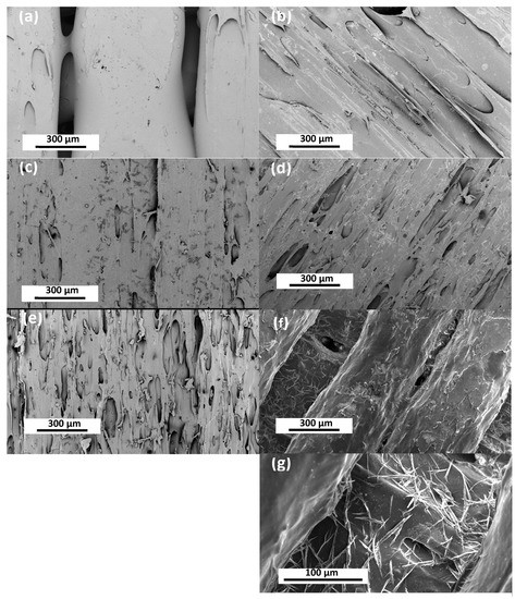 SEM images of the 3D printing components after immersion in water (left) and artificial sweat (right). (a,b) TPU with 0.75 wt% PVP-coated AgNPs (18 nm average size), (c,d) PA12 with 8.6 wt% CCFs and 7.5 wt% SPIONs. (e,f) TX1501 (Tritan Copolyester TX1501HF—Eastman) with 7.3 wt% CCFs. (g) Detail image showing the integration of the CCFs within the polymeric matrix of the TX1501. Surface deterioration and salt formation are evident after immersion in artificial sweat in every 3D-printed test coupon. Imaging utilizes backscattered electron detector, at 5 kV, 350× magnification (a–f), while (g) is magnified 1600×.