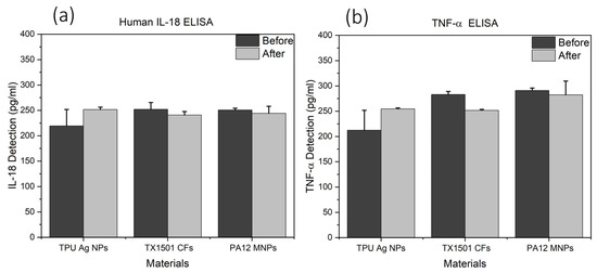 After performing the calibration curves for IL-18 and TNF-α and the subsequent analysis of concentrations (pg/mL) obtained by means of the equation of the straight line generated by the calibration curve, the average of each sample was calibrated and compared with the respective control (only cells without any material, not shown in the graph), and materials before and after leaching were compared to each other as shown in the graphs (Figure 12). The results were analyzed by performing a one-way analysis of variance (ANOVA) test. p-values > 0.05 were not considered statistically significant. Although TPU samples after leaching seem to minimally increase the detection of the proinflammatory cytokines, no significant changes were observed, leading to the conclusion that leaching tests in artificial sweat, simulating use conditions, might not affect the material’s skin sensitizing potential. Measurements of more inflammatory factors would better elucidate this finding.