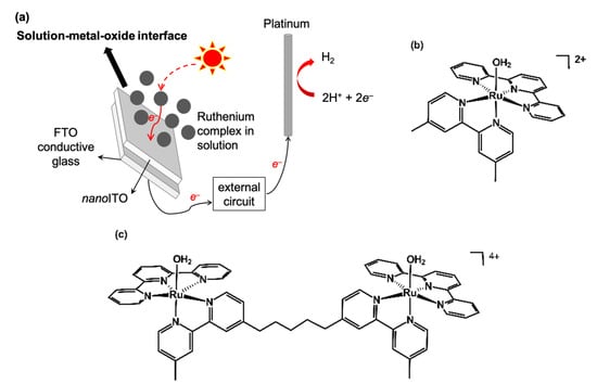 Although a study of the photo-driven hole and electron transfer using surface-bound ruthenium complexes on indium tin oxide nanoparticles (nanoITOs) has been published [,,,], the use of nanoITOs for photo-driven water splitting research has not been widely explored, despite having a band gap range (3.5–4.3 eV) suitable for water splitting []. In this work, we explore for the first time the photo-electrochemistry of ruthenium complexes using a nanoITO working electrode in the metal-oxide–solution interface, as shown in Figure 1a. The novel PEC technique is composed of a mononuclear ruthenium complex [Ru(terpy)(Me2bipy)(H2O)]2+ (1-H2O) and dinuclear [{Ru(terpy)(H2O)}2(μ-bb5)]4+ (2-H2O) (where terpy = 2,2′:6′,2′′-terpyridine; Me2bipy = 4,4′-dimethyl-2,2′-bipyridine; and bb5 = bis[4(4′-methyl-2,2′-bipyridyl)]-1,5-alkane) dissolved in a pH 7 buffer solution, which interacts with light on the electroactive nanoITO surface. We present the study of the photo-induced ligand exchange of the precursor complexes [Ru(terpy)(Me2bipy)(Cl)]+ (1-Cl) and [{Ru(terpy)(Cl)}2(μ-bb5)]2+ (2-Cl) to the corresponding 1-H2O and 2-H2O complexes, the TD-DFT calculations, electrochemistry and photo-electrochemistry, incident photon to current efficiency (IPCE) and spectro-electrochemistry to reveal the photo-electrochemical properties of the in situ-generated 1-H2O and 2-H2O in the solution-based PEC platform.