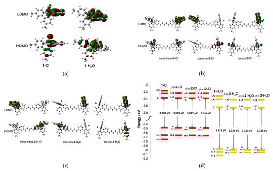 (a) The HOMO and LUMO surface plots of 1-Cl and 1-H2O; (b) the HOMO and LUMO surface plots of trans-trans-2-Cl, trans-cis-2-Cl and cis-cis-2-Cl; (c) the HOMO and LUMO surface plots of trans-trans-2-H2O, trans-cis-2-H2O and cis-cis-2-H2O; (d) HOMO and LUMO energies of all geometric isomers of 2-Cl and 2-H2O, showing the stabilization of both HOMO and LUMO following the formation of the aqua forms, although there was an apparent increase in the HOMO–LUMO energy gap consistent with the experimental electronic absorption presented in Table S1.