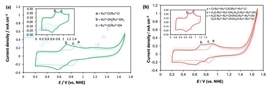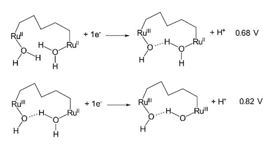 Complexes 1-H2O and 2-H2O were generated in situ by irradiating 1-Cl and 2-Cl solutions in the pH 7 phosphate buffer, respectively, for 15 min. Figure 3a displays the CV of 1-H2O, which exhibited two one-electron redox cycles at 0.67 V and 0.82 V, respectively. These cycles were attributed to the proton-coupled electron transfer (PCET) processes RuII(H2O)/RuIII(OH) and RuIII(OH)/RuIV=O, respectively []. These results confirmed the photo-induced aquation process, which was consistent with the UV–Vis and 1HNMR observations described earlier. The pH-dependent PCET and evidence of one-electron oxidation of RuII(H2O) to RuIII(OH) in neutral pH was reported on previously [,]. In contrast to 1-H2O, the CV of the in situ-generated aqua complex 2-H2O exhibited multiple cathodic peaks that were clearly identified when scanned from 0.2 to 1.6 V, although the forward anodic scan showed only two distinctive peaks (Figure 3b). While the CV scan from 0.2 to 1.2 V featured two well-defined redox cycles (inset of Figure 3b), the presence of the multiple cathodic peaks after the forward anodic scan to 1.6 V indicated the accumulation of higher oxidation 2-H2O states on the nanoITO surface beyond 1.2 V. This provided evidence of the stepwise one-electron PCETs in 2-H2O. Moreover, unlike 2-Cl, the HOMO surface plots of all the geometric isomers of 2-H2O exhibited a nonidentical electron distribution pattern of the two coordination sites (Figure 2c). This strongly suggests that each site possesses different redox behavior. As a result, the two redox cycles noticed for 2-H2O were assigned as a stepwise one-electron oxidation: (H2O)RuII–RuII(OH2)/(H2O)RuII–RuIII(OH) (0.68 V) and (H2O)RuII–RuIII(OH)/(HO)RuIII–RuIII(OH) (0.82 V). Consistent with the PCET via hydrogen bonding in the dinuclear ruthenium complexes bridged by a nonflexible linker [], in the current study, 2-H2O was proposed to feature a hydrogen-bonded PCET, because the flexibility of the alkyl bridge would allow for the orientation of the two coordination sites to be optimal for hydrogen bonding, as demonstrated in Figure 4. The complete assignments of the redox potentials of each complex are presented in Table 1.