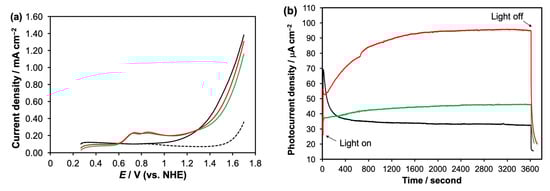The photo-electrochemical (PEC) conversion of water to hydrogen fuel has attracted much interest because of its potential to realize sustainable energy devices that can eventually replace fossil fuels [,,]. However, electrocatalytic water splitting driven by photon energy has yet to achieve efficiency and durability levels suitable for practical application [,,,,,,]. Perhaps the challenging aspect in this regard is that the water oxidation half reaction (2H2O → O2 + 4H+ + 4e−) is a difficult process that requires efficient water oxidation catalysts. Despite its energy-demanding nature, the 1.23 V thermodynamic requirement for water oxidation can be driven by light using semiconductors with appropriate band gaps [], although the main challenge is that most metal oxide semiconductors do not catalyze the water oxidation reaction efficiently. Considerable efforts to improve the efficiency of low-cost semiconductors, such as TiO2, BiVO4 and Fe2O3, have recently been undertaken through many different techniques, including heterojunction, band alignment [,,,,,,,] and the incorporation of cocatalysts [,,,,,,,].