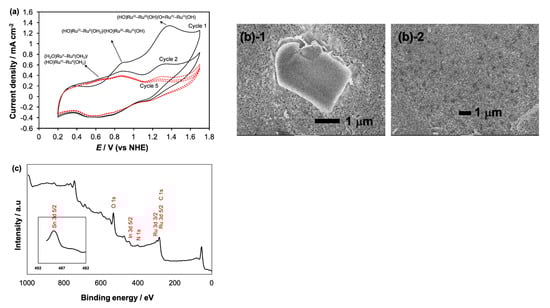 The curve-shaped photocurrent response shown by 2-H2O that was significantly higher than the other two systems was indicative of the chemical processes unique to the dinuclear complex occurring during the photolysis on the surface of the nanoITOs. Our SEM investigation of the nanoITO surface after the photolysis in the presence of 2-H2O revealed the deposited microparticle, as shown in Figure 6b(1). While no deposition occurred for 1-H2O (Figure 6b(2)), the greater photocurrent by 2-H2O must have, therefore, been caused exclusively by the photo-electrochemical process involving the accessible redox states of the dinuclear complex. The CV analysis of the deposited product in the phosphate buffer (Figure 6a) showed two redox cycles at E1/2 0.82 V and 1.28 V, which were assigned to the (H2O)RuII–RuIII(OH)/(HO)RuIII–RuIII(OH) and (HO)RuIII–RuIII(OH)/(HO)RuIII–RuIV(O) redox events, respectively. Therefore, we suspected that the deposited product was the dinuclear complex in its oxidized (H2O)RuII–RuIII(OH) form that accumulated on the nanoITO surface. As seen in Figure 6a, although the first CV cycle of the deposited complex displayed two distinctive redox cycles, the current height belonging to (HO)RuIII–RuIII(OH)/(HO)RuIII–RuIV(O) gradually decreased as further cycles proceeded, accompanying the appearance of the (H2O)RuII–RuII(OH2)/(H2O)RuII–RuIII(OH) redox. Therefore, during the multiple CV scans, the complex returned to its (H2O)RuII–RuII(OH2) state. The decrease in the current heights after multiple scans was possibly due to the dissolution of the deposited microparticle in the buffer solution. The XPS spectrum of the deposited product on the nanoITOs (Figure 6c) showed the presence of Ru 3d 3/2, Ru 3d 5/2, C 1 s, O 1 s and N 1 s at binding energies 298, 285, 285, 533 and 402 eV, respectively [], which further confirmed the deposition of the dinuclear complex molecule on the surface.