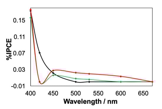 The incident photon-to-charge carrier efficiencies (IPCEs) of the nanoITOs in buffer only and in the presence of the aqua complexes were measured in a custom-made three-electrode cell. The cell consisted of a Ag/AgCl reference electrode, FTO/nanoITOs as the working electrode and Pt as the counter electrode. To obtain monochromatic lights ranging from 400 to 670 nm, Xenon light was filtered through appropriate bandpass filters. The intensity of the light was measured using an ADCMT 8230E Optical Power Meter from ADC Corporation (Toyama, Japan). The measurement was conducted with an external bias of 1.0 V vs. NHE. The data parameters were collected and calculated according to Equation (1).