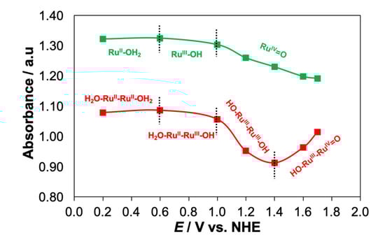 Figure 8 shows the redox state regions of 1-H2O and 2-H2O derived from the spectro-electrochemistry experiments performed in the range 0.2–1.7 V (see Figures S5–S7). A close inspection of the absorbance changes in the MLCT band plotted against the applied potential for 1-H2O revealed the presence of three regions corresponding to RuII(OH2), RuIII(OH) and RuIV(O), while 2-H2O displayed four distinctive regions belonging to (H2O)RuII–RuII(OH2), (H2O)RuII–RuIII(OH), (HO)RuIII–RuIII(OH) and (HO)RuIII–RuIV(O), which confirmed the stepwise one-electron PCET in 2-H2O.